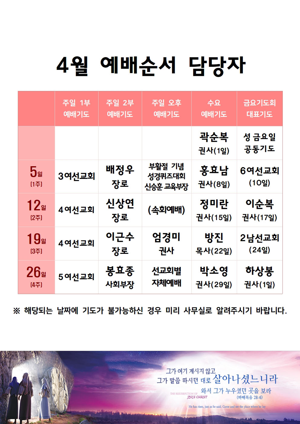 04월 예배순서 담당자 안내입니다.